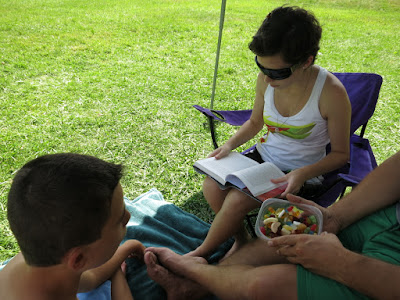 Wir hatten unser Canopy mitgebracht, was uns wieder sehr gute Dienste als Sonnenschutz geleistet hat. Das Ding ist wirklich schnell aufgebaut und hat eine angenehme Größe. Das Gute an einem Ausflug in die Berge ist auch immer, daß es dort oben ein paar Grad kühler ist als bei uns hier in Hickory. An diesem Tag waren es in Hickory 97 F (=36.1° C) und oben in Blowing Rock 85 F (29.4° C) und dazu ging zeitweise auch ein angenehmes Lüftchen.