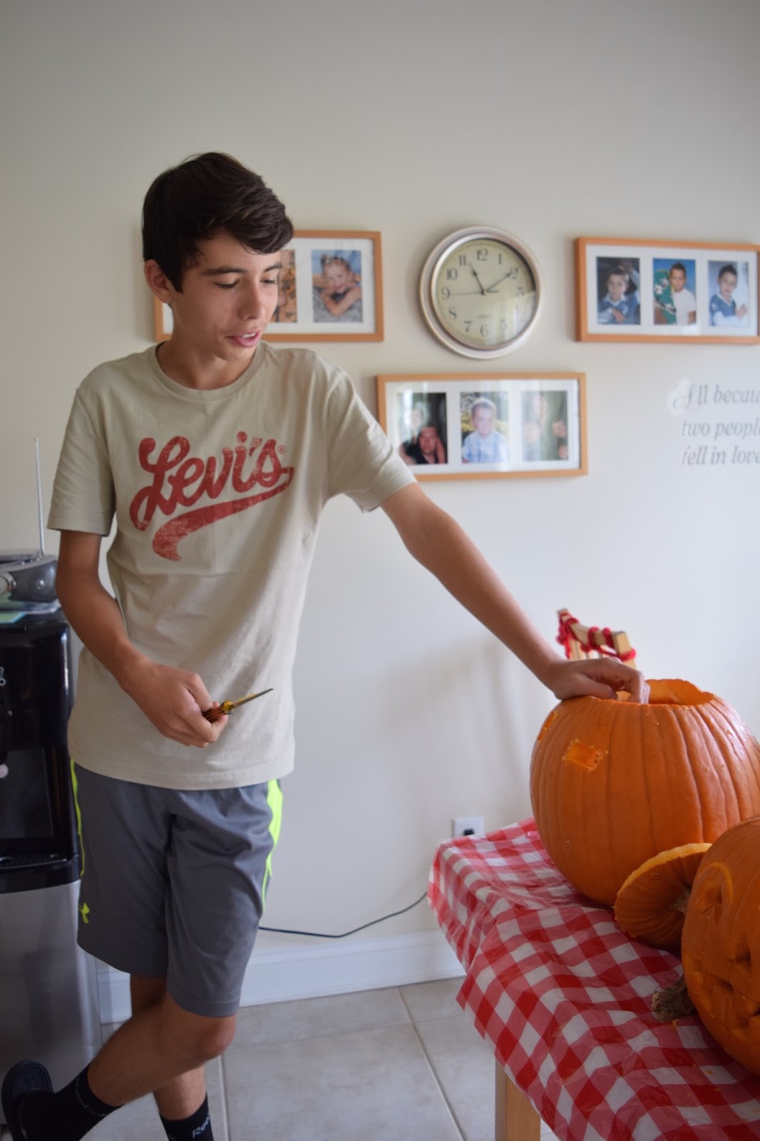 Wir hatten die Kürbisse schon seit ein paar Wochen vor der Tür zur Deko stehen. Da unsere Wetter so warm ist, empfiehlt es sich nicht, die Kürbisse zu früh zu schnitzen, da sie sonst in wenigen Tagen total verschimmeln würden. Ein Tag vor Halloween ist aber ein guter Zeitpunkt ;-).
