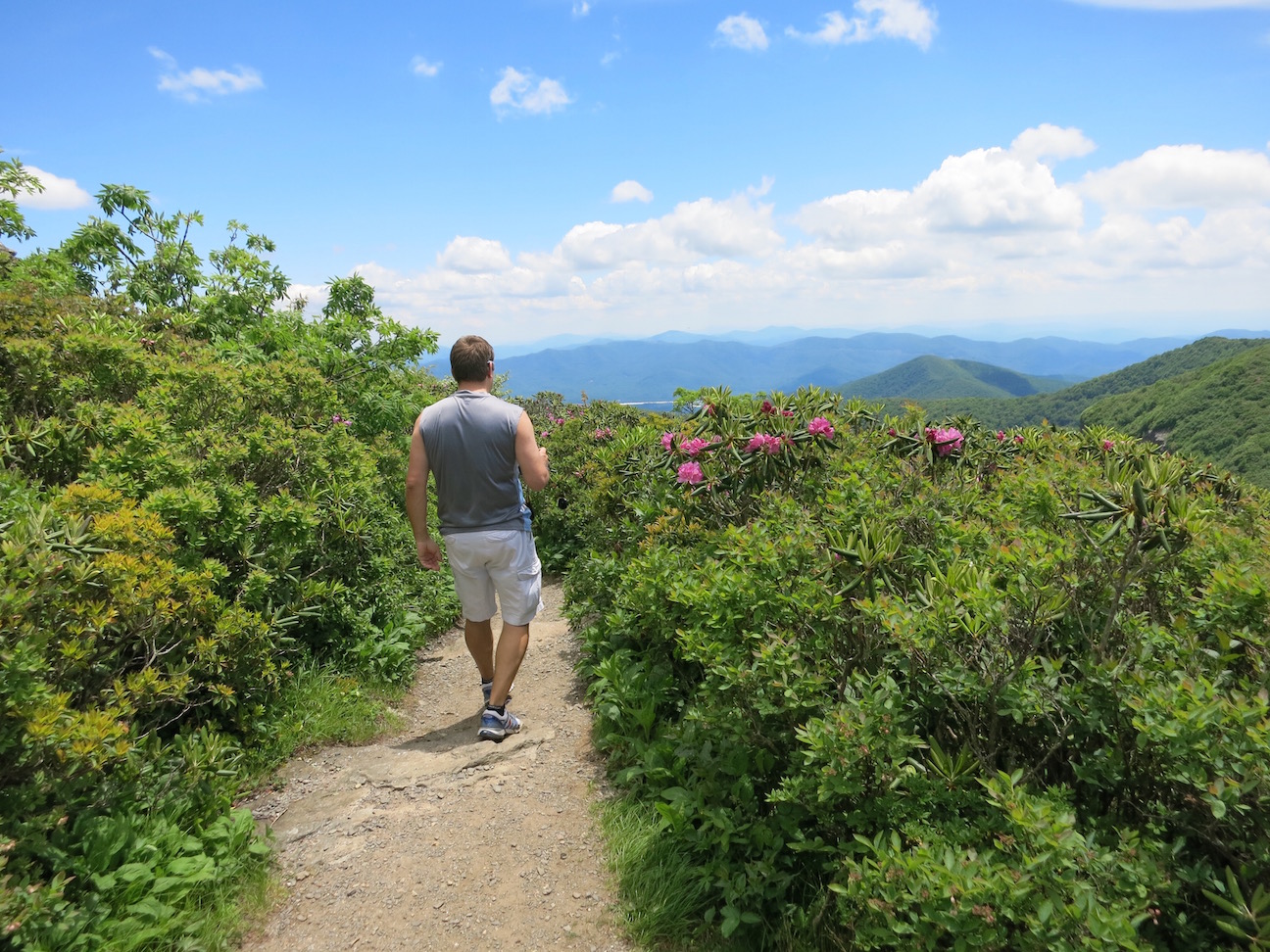Wir wanderten den Graggy Pinnacle Trail, der zu dieser Jahreszeit besonders schön aussieht, denn man wandert überwiegend durch einen Tunnel von blühenden Rhododendronbüschen.