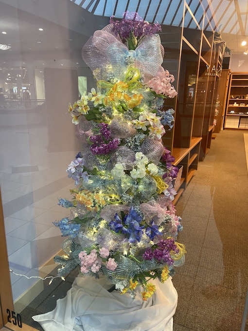 Wir waren mal in der Mall in Hickory, wo wir gerne mal Indoor ein paar Runden gehen. Dort hatte ich wieder den Weihnachtsbaum im Schaufenster fotografiert, der rund ums Jahr immer passend zur Jahreszeit oder Feiertag anders dekoriert ist. Diesmal war er mit frühlingshaften Blumen dekoriert: