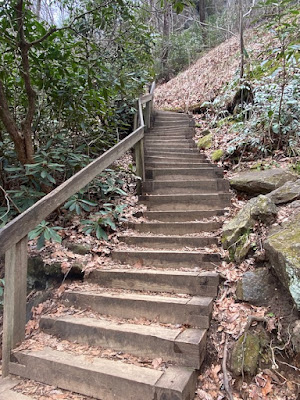 Wir sind danach noch weiter den High Shoals Loop Trail gewandert. Es geht erst wieder viele Stufen hoch, bis man oberhalb des Wasserfalles das Wasser überquert und auf der anderen Seite wieder hinunter wandert.
